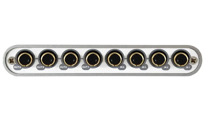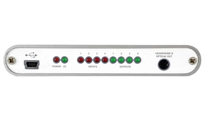 Ein mit 12 cm Breite sehr kompakte externe Soundkarte mit 4 Line-Eingängen und 4 Line-Ausgängen auf der Rückseite, alle als Cinch-Buchsen ausgeführt. Der Nennpegel liegt bei typischen -10 dBV. Frontseitig ist rechts der Kopfhöranschluss mit seiner 3,5 mm Miniklinkenbuchse, die bei Bedarf auch als optischer S/PDIF-Ausgang dienen kann. Links sind der USB-Port sowie daneben 10 LEDs als Betriebs- und Signalanzeige.