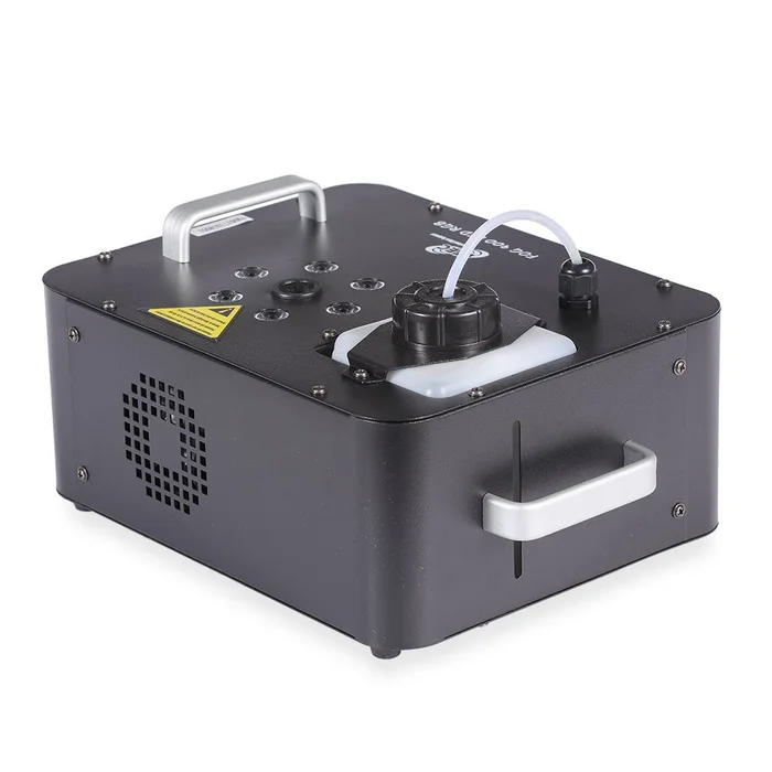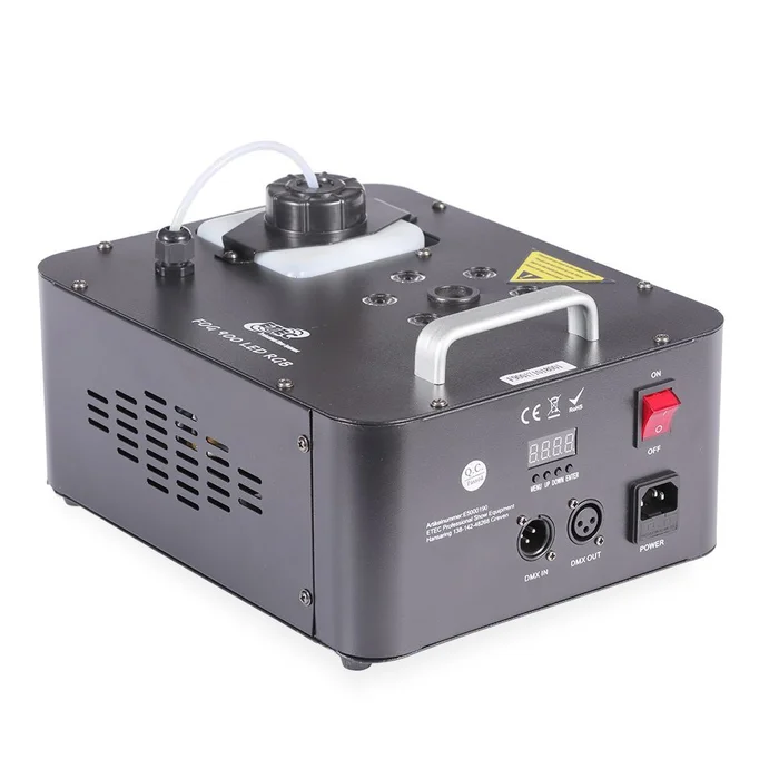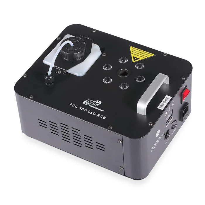 Beschreibung:Die ETEC FOG 900 ist eine Vertikal-Nebelmaschine die einen CO2 Effekt mit Beleuchtung imitiert. Der Geyser verfügt über 900 Watt Heizleistung und erzeugt einen großen Nebelausstoß. Um die Nebel-Austritssdüse der ETEC FOG 900 befinden sich sechs LEDs die kreisförmig angeordnet sind. Jede der LED hat eine Leistung von 3 Watt und gibt das RGB Farbspektrum wieder. Die Steuerung erfolgt über die im Lieferumfang enthaltene Fernbedienung oder über DMX.Technische Daten:Leistungsaufnahme: 900WVersorgungsspannung: 110 – 230VSpannungsfrequenz: 50 / 60HzAufwärmzeit: 5 MinutenNebelausstoß: 15m³ pro MinuteAusstoßehöhe: 3-4 MeterTankinhalt: 2 LiterDiode Typ: 3in1Anzahl der Dioden: 6Diodenleistung: 3WFarbe: RGBAC IN: IEC – C14DMX IN/OUT: XLR – 3 polHöhe: 215mmBreite: 300mmLänge: 400mmGewicht: 4 KgVideo: