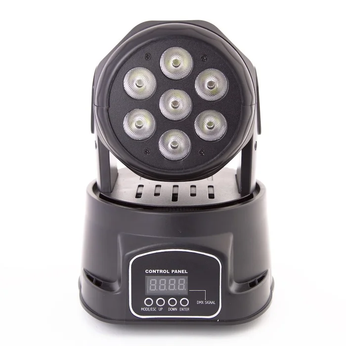 Beschreibung:Der ETEC Moving Head LED Washer 7x10W RGBW 4in1 in seiner neuen robusten und kompakten Version scheint mit sieben leistungsstarken Quadcolor-LEDs. Durch Anwendung der neuen RGBW-Dioden wurde die Qualität der Farbmischung und -palette erheblich verbessert. Obwohl das Gerät sehr klein und kompakt ist, emittiert es mit den LED-Dioden ein sehr starkes Licht. Die Lichtquelle besteht aus sieben 10-Watt-Dioden mit denen eine Gesamtleistung vom bis zu 70 Watt erzielt werden. Dabei arbeitet der Moving Head immer leise, was eine Vielzahl an Anwendungen ermöglicht.Technische Daten:Spannung: AC 90-240V, 50Hz/60HzLeistungsaufnahme: 90 WattLED: 7x10W RGBW 4in1LED Abstrahlwinkel: 25°Maximale PAN-Bewegung: 540°Maximale TILT-Bewegung: 180°Betriebsmodi: DMX512, Manuell, Audio-, Automatik Programm, Master / SlaveDMX-Steuerung: 9/14 KanäleControl Panel: Digital 4 alphanumerische ZeichenMaximale Umgebungstemperatur: 40 ° CBrutto-Gewicht: 3KgMaße: 180 x 180 x 285 mmVideo: