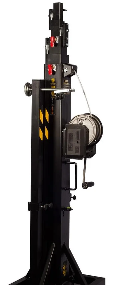 Dieser Teleskoplift wurde entwickelt um schwere Lasten bis zu einer Höhe von 6.40m zu heben. Dies ermöglicht, daß der Tower neben der Bühne auf dem Boden stehen kann und immer noch ausreichend Beleuchtungshöhe erreicht wird.