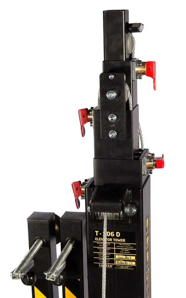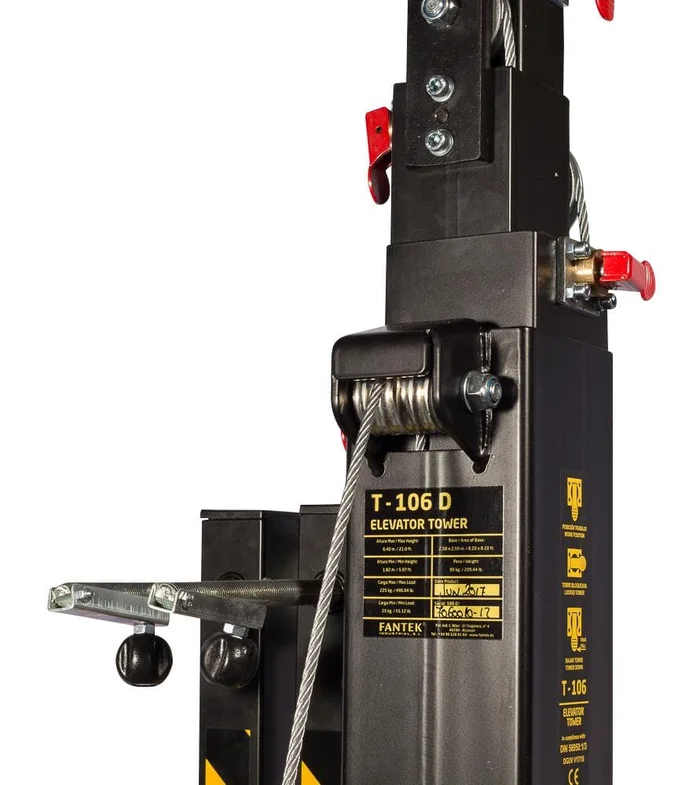Der Turm T 106 D ist bereit, eine Last von 225 kg in einer Höhe von 6,4 Metern zu heben. Er besteht aus fünf ausziehbaren Stahlprofilen, die durch ein hochfestes Stahlseil mit gerippten, SELOIL-gelagerten Umlenkrollen angehoben werden. Er ist mit einer Weiterentwicklung ausgestattet, die das Heben von Lasten auf 6,4 Meter Gesamthöhe ermöglicht.