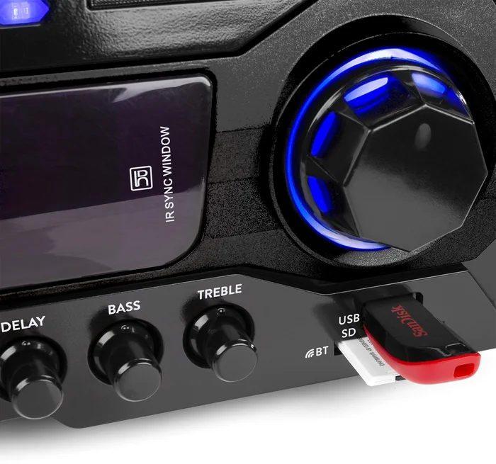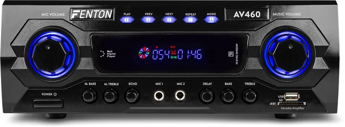 Der AV460 ist ein moderner 2-Kanal-Verstärker mit 2x 250 W, der mit einem Multimedia-Player und blau beleuchteten Tasten ausgestattet ist. Ausgestattet mit einer Fernbedienung, zwei Mikrofoneingängen mit Klangregelung für Karaoke-Anwendungen, Echo-Kontrolle und einem dynamischen Bildschirm-Display. Auch perfekt für Anwendungen als HiFi und Hintergrundmusik.