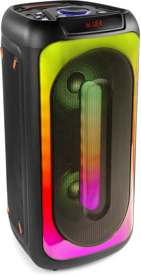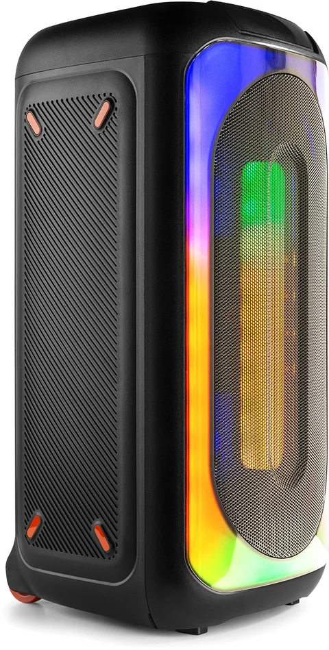 Dreh den Spaß auf! Bringen Sie Ihre Party auf ein neues Level mit dem BoomBox Wireless Party Speaker, der eine spektakuläre, beat-synchrone Lichtshow über die gesamte Front bietet. Dank des eingebauten Akkus, des Mikrofons und der zahlreichen Anschlussmöglichkeiten – USB, Micro-SD-Karte und eine eingebaute Mikrofonbuchse – können Sie alle Ihre Lieblingssongs ganz einfach mitsingen. Der BoomBox-Party-Lautsprecher ist mit Rädern und einem Griff ausgestattet und kann sowohl horizontal als auch vertikal verwendet werden, was für zusätzliche Flexibilität sorgt. Es ist auch möglich, zwei BoomBox Party Speaker kabellos miteinander zu verbinden, um einen noch kraftvolleren Stereosound zu erzeugen. Ideal für Home Entertainment, Karaoke, Schulen, Seminare und viele andere Anwendungen.