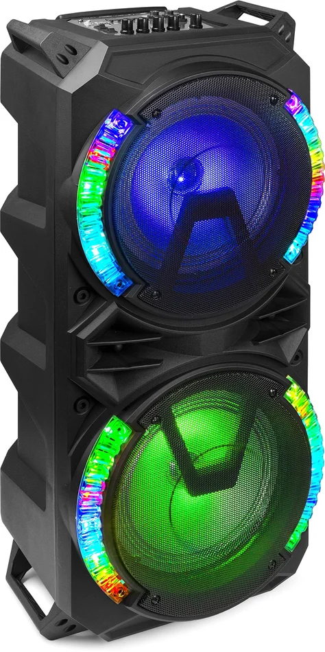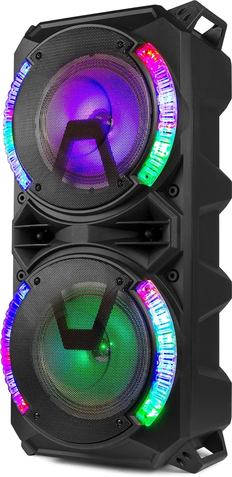 Das ist die LIVE280 Karaoke Station. Dieser leistungsstarke 2x 8″-Lautsprecher mit eingebautem Akku und Verstärker verfügt über 2 Mikrofone. Er ist außerdem mit BT-Technologie ausgestattet, um Ihre Lieblingsmusik von Ihrem Smartphone, Tablet oder PC zu streamen, und verfügt über einen integrierten Media-Player, an den Sie eine microSD-Karte/einen USB-Stick zur direkten Musikwiedergabe anschließen können. Die schaltbare, soundgesteuerte RGB-LED-Beleuchtung um die Lautsprecher herum verleiht jeder Party oder Veranstaltung einen tollen Effekt. Für diejenigen, die es lieber etwas ruhiger angehen lassen, ist eine Fernbedienung im Lieferumfang enthalten, mit der der LIVE280 aus der Ferne bedient werden kann.