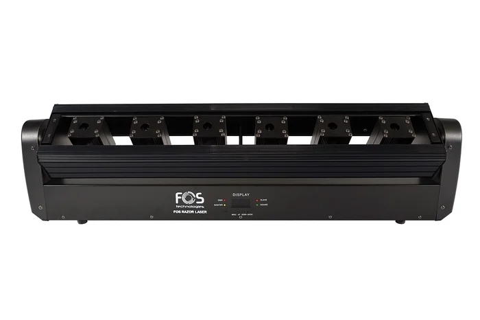 Der FOS Razor Laser ist ein spezieller 6 Schrittmotor-Moving-Head-Laser mit RGB Vollfarbe. Er besitzt insgesamt 3 Watt Gesamtleistung, welche sich auf 6 Module mit jeweils 500 mw aufteilen. Die Leistungsverteilung je Beammodul beträgt Rot: 100 mw / Grün: 200 mw / Blau: 200 mw. Die Pan / Tilt Y-Achse beträgt 240° / 270°. Steuerbar per DMX512 (11/26/38CH).