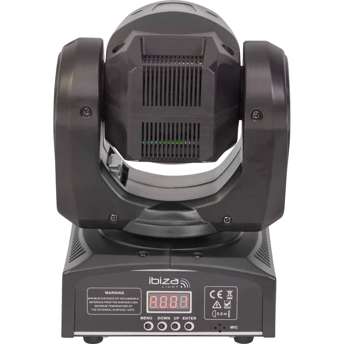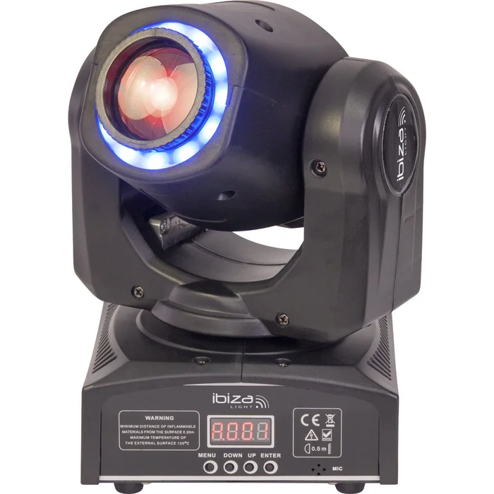 Beschreibung:Bei dem MHSPOT30-FX von Ibiza handelt es sich um einen 30 Watt starken LED Moving Head Spot. Der MHSPOT30-FX verfügt über separate Gobo- und Farbräder und kann durch die 7 Farben + offen und 7 Gobos + offen unzählige Gobo/Farb Kombinationen erstellen. Ein LED Ring aus 12 0,5 Watt starken RGB SMD’s ist als zusätzlicher Effekt verbaut, der sogar in 4 Sektionen aufgeteilt ansteuerbar ist. Er ist dank der starken LED Engine erstaunlich hell und kann sich gut durchsetzen- auch wenn der Raum nicht komplett abgedunkelt ist. Das macht das Gerät beispielsweise besonders interessant für Messen und Hotelbars. Die Optik ist manuell fokussierbar und über das moderne 4-Tasten On-Board Digital Menü mit LED Display können alle Einstellungen vorgenommen werden. Dort sind auch die Betriebsmodi abrufbar: musikgesteuerter Modus, Automatikmodus, Master/ Slave Modus oder DMX. Über 9 oder 11 Kanäle kann die DMX Ansteuerung erfolgen. Die tollen Effekte, wie z.B. Pulse, Gobo-Shake, Dimmer, Strobe und Rainbow-Scrolling machen den MHSPOT30-FX 30 zu einem großartigen Begleiter für mobile Entertainer. Das Gerät ist dank seiner kompakten Abmessungen und des geringen Gewichts nahezu überall hängend oder stehend einsetzbar. Im Lieferumfang ist das Zubehör zum Anschließen des Gerätes ans Stromnetz sowie zum Aufhängen enthalten. Mit hellen Projektionen, flinken PAN/TILT Bewegungen und dem tollen Zusatzeffekt des RGB LED Rings erweist sich der IBIZA MHSPOT30-FX als eine große Überraschung.