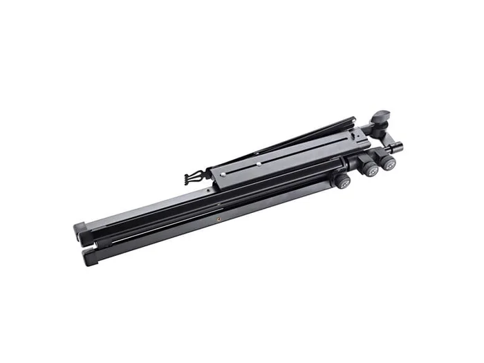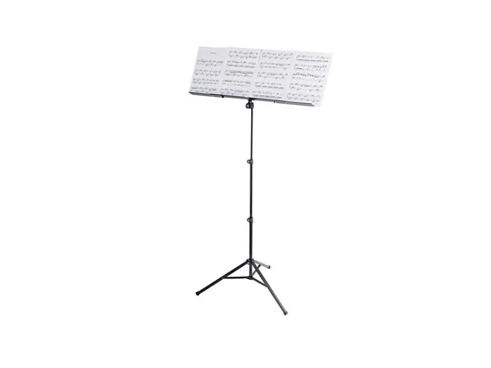 Notenpult mit ausziehbarer Notenauflage. Die beiden Notenauflagen können jeweils nach außen ausgezogen werden und ermöglichen zusammen mit den zusätzlichen Blatthaltern die sichere Ablage von vier nebeneinander liegenden DIN A4 Seiten. Die komfortable Schrägstellung erfolgt mittels einer feinen Zahnrasterung aus Zink-Druckguss. Das zweifach ausziehbare Notenpult lässt sich zudem kompakt zusammenlegen.
