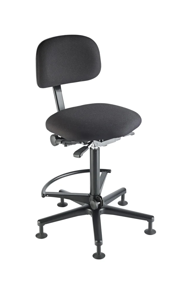 Beschreibung: Komplett einstellbarer Bassstuhl mit gepolstertem ergonomischem Sitz und Rückenlehne. Die Höhe ist stufenlos von 595 bis 850 mm einstellbar. Polsterung und Stoff (Trevira CS) sind aus schwer entflammbarem Material. Der schwarze Stoff weist eine Strapazierfähigkeit von 100.000 Scheuertouren auf. Das schwarz gepulverte 5-Fußuntergestell bietet perfekte Stabilität. Die stufenlos höhenverstellbare Drittelkreis- Fußstütze und der bequeme Sitz mit Beinaussparung sorgen für erweiterten Sitzkomfort. Für den Einsatz ohne Fußstütze kann diese einfach nach hinten weg gedreht werden. Die Verstellung der Sitzhöhe erfolgt pneumatisch und stufenlos über einen Auslösehebel. Die Höhe der Lehne und die Sitzneigung sind ebenfalls einstellbar. Geräuscharme und rutschhemmende Füße gehören ebenfalls zum Lieferumfang.