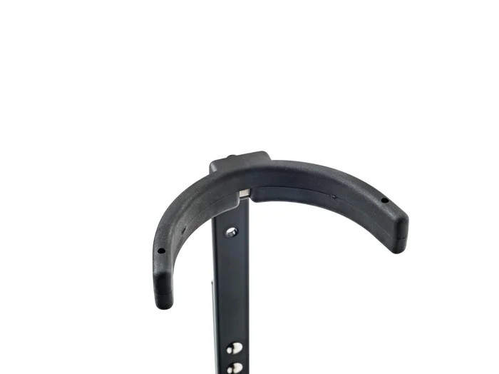 Zusammenlegbarer Abstellständer mit Bodenausgleichschrauben. Bügel sind in Höhe und Breite verstellbar und mit weichem Baumwollsamt überzogen. Große Instrumentenauflageschale aus Kunststoffmaterial mit einer zusätzlichen Aussparung für Instrumente mit Kamm.