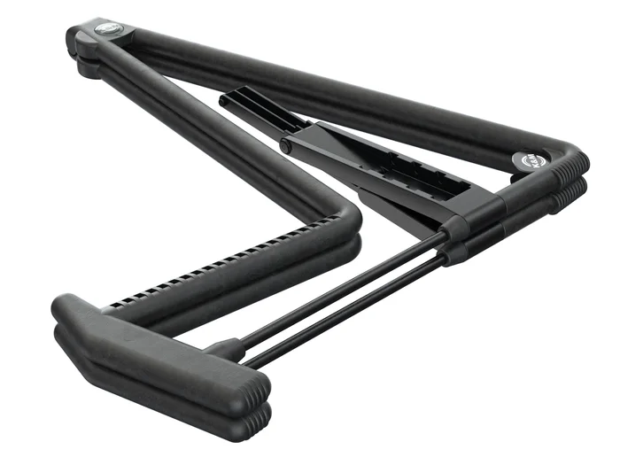 Weltweit bewährter Gitarrenständer. Dank der ausgefeilten neuartigen Struktur der Gummierung wird das Instrument besonders schonend gehalten. Eine innovative verstellbare Verbindungsstrebe ermöglicht es, Gitarren in unterschiedlichen Größen oder auch andere Instrumente wie z.B. Cello oder Waldhorn platzsparend aufzunehmen. Zur Aufbewahrung oder zum Transport kann der Ständer äußerst flach und kompakt zusammengelegt werden. Zudem wurde an eine praktische Transportsicherung gedacht. Ein weiteres Feature sind die beiden integrierten Plektrenhalter. Der Heli 2 ist in den Farben schwarz, rot, blau und kork erhältlich.