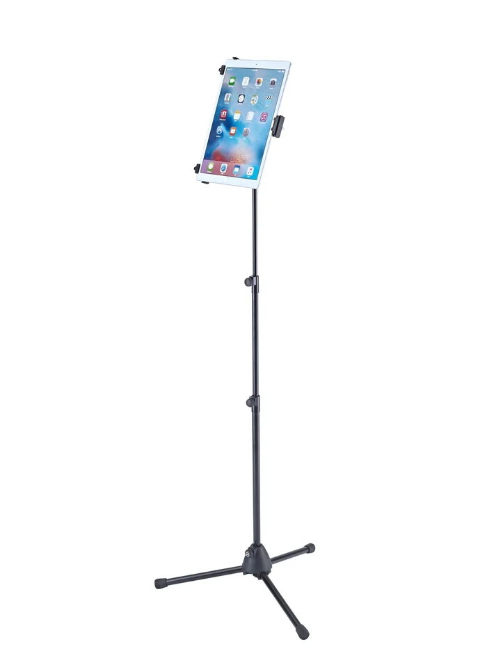 Die Kombination aus Stativ und Universal Tablet Halter unterstützt Sie auf der Bühne genauso wie zu Hause oder im Studio. Die individuell einstellbaren Haltearme ermöglichen den Einsatz von Tablets mit einer Höhe von 222 bis 334 mm und einer Breite von 128 bis 232 mm (wie z. B. iPad, iPad Air, iPad Pro, Amazon Fire HDX 8.9, Samsung Galaxy Tab ab 9.7, Google Nexus 9, Asus Transformer oder Microsoft Surface sowie Surface Pro). Die Tiefe des Tablets kann dabei zwischen 6 und 11 mm variieren. Beim erstmaligen Einstellen werden die drei Haltearme mittels Klemmschrauben auf die Größe und Tiefe des Tablets eingestellt. Für die weitere Nutzung wird das Tablet dann ganz einfach und schnell über einen Schnappverschluss eingesetzt und auch wieder entnommen. Eine handliche Flügelmutter ermöglicht die stufenlose Einstellung der Neigung, so dass jeder Anwender seine individuelle Position leicht finden kann. Das Tablet kann zwischen Hoch- und Querformat kurzerhand gedreht werden, wobei ein selbstständiges Drehen verhindert wird. Das leichte und 2-fach ausziehbare Stativ lässt sich stufenlos auf eine Höhe zwischen 70 und 155 cm einstellen. Ein kleines kompaktes Packmaß sorgt für einen angenehmen Transport.