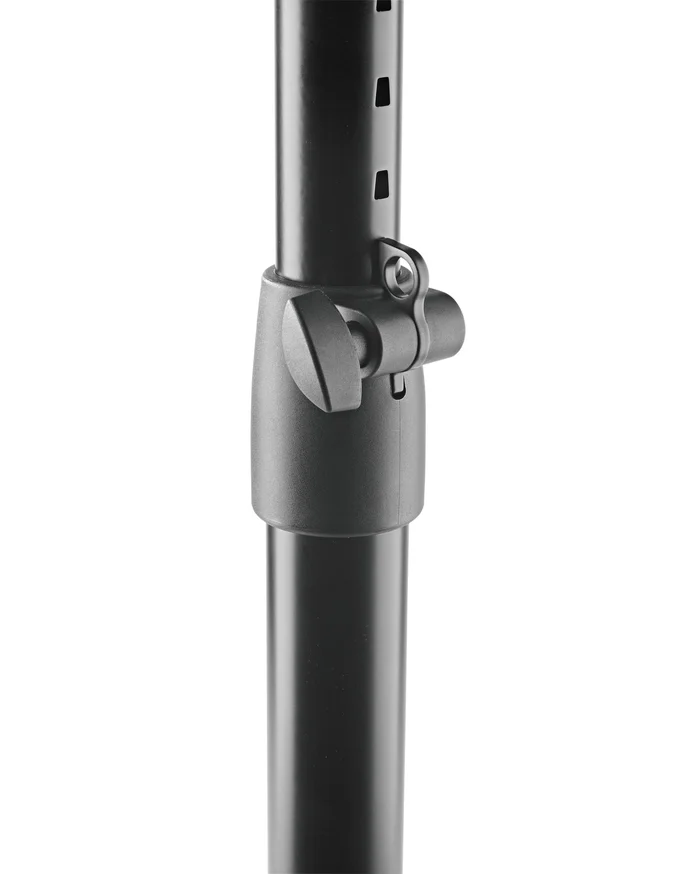 Funktionelles Bodenstativ für Nahfeldmonitore und Lautsprecher. Die solide und formschöne Stahlkonstruktion besticht durch ihre enorme Stabilität und hält Ihre Boxen sicher in der gewünschten Ausrichtung. Für eine akustische Entkopplung bei wackelfreiem Stand sorgt die flache Dreifuß- Konstruktion mit den großen Gummiauflagen. Die Auflageplatte mit den selbstklebenden Gumminoppen hat die Maße 205 x 245 mm. Für eine optimale Abhörhöhe sind sechs Stufen zwischen 677 und 1132 mm wählbar. Die schlanke Spannschelle mit dem praktischen Sicherungshaken ist dabei leicht und komfortabel zu bedienen. Die Kabel können alternativ im Rohrinneren durchgeführt werden (ohne Stecker). Bei zentrischer Belastung ist eine Tragkraft von 35 kg möglich.