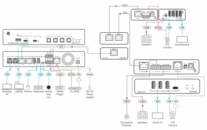 - Einfache USB-Peripheriesteuerung – IP-gesteuerte oder serielle Fernsteuerung über die CAT-erweiterten Steuersignale der angeschlossenen USB-Peripheriegeräte, wie z.B. PTZ-Kameras und Soundbars, durch ein entferntes LAN-verbundenes Steuersystem (z.B. Kramer Control).