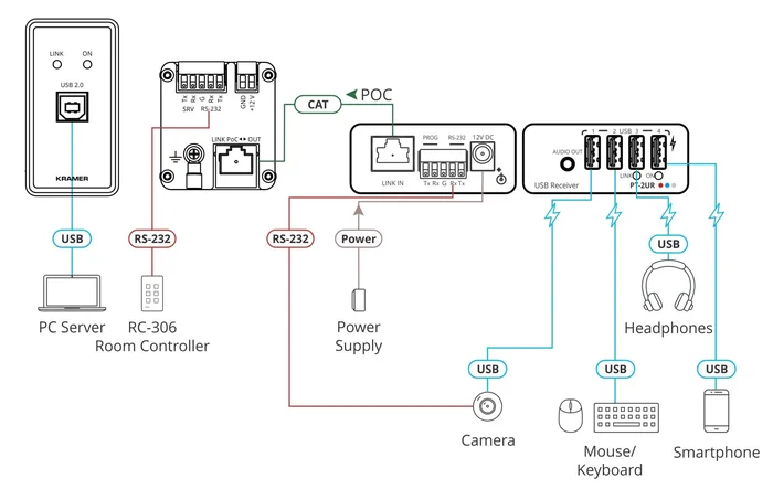 - Flexible USB–Verbindungen — Die Signale von einer Vielzahl von USB–Peripheriegeräten können verlängert werden, einschließlich Kameras, Touch Screens, Smart Boards, Festplatten, Game Controller, Audiogeräten, Druckern, Scannern oder HIDs (Human Interface Devices) wie Maus oder Tastatur. Dual Role — und OTG — (On–the–Go–) Geräte wie Smart Phones und Tablets, die entweder an einen USB Host Port auf der Übertragerseite oder an einen USB–Geräteport auf der Empfängerseite angeschlossen sind, können entweder mit einem entfernten Host oder mit einem gekoppelten Peripheriegerät kommunizieren.