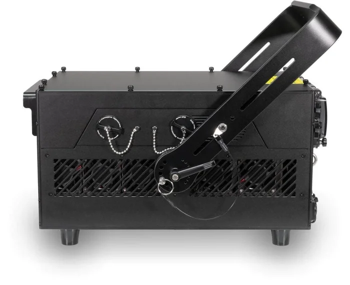 Das gesamte Gerät ist nach der Sealed Housing Technology aufgebaut, wodurch der Wartungsaufwand auf ein Minimum reduziert werden kann. Die Kühlung erfolgt über den aussenliegenden Kühlkörper. Der Showlaser kommt mit einer internen PSU zur einfacheren Handhabung. Auf der Geräterückseite befinden sich Schalter, mit denen die Projektion auf der X- / Y-Achse gespiegelt werden kann. Zusätzlich verfügt der Laser über ein Scan Safety, das ebenfalls auf der Geräterückseite eingestellt werden kann.