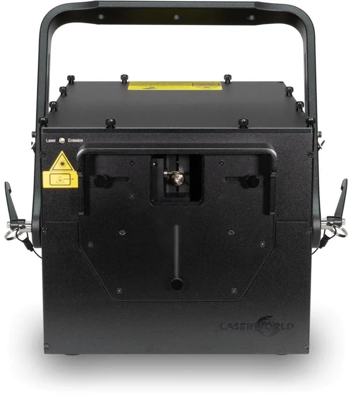 Das gesamte Gerät ist nach der Sealed Housing Technology aufgebaut, wodurch der Wartungsaufwand auf ein Minimum reduziert werden kann. Die Kühlung erfolgt über den aussenliegenden Kühlkörper. Auf der Geräterückseite befinden sich Potis, mit denen die Einzelfarben bzw. die Farbbalance einfach angepasst werden können. Dort kann auch die Projektion auf der X- / Y-Achse gespiegelt werden. Zusätzlich verfügt der Laser über ein Scan Safety, das ebenfalls auf der Geräterückseite eingestellt werden kann.
