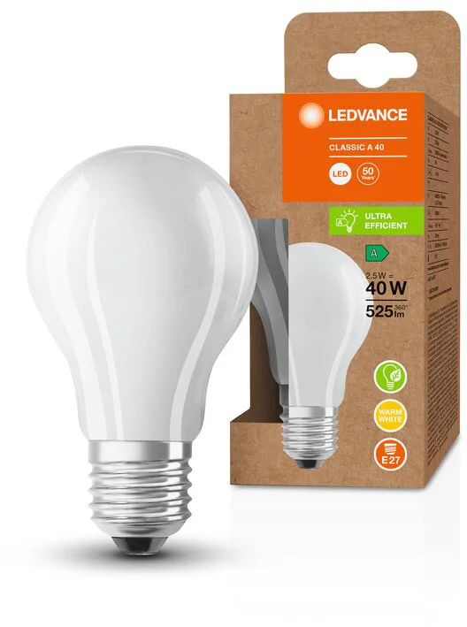 LED-Lampen, klassische Glühlampenform, ENERGIEEFFIZIENZKLASSE A. Produktmerkmale: LED-Lampen für Netzspannung. Abstrahlwinkel: bis zu 300°. Sehr lange Lebensdauer von bis zu 50.000 h. Sehr hohe Anzahl von Schaltzyklen: 500,000. Lichtausbeute: bis zu 210 lm/W. Produktvorteile: Lampen mit innovativer LED-„Filament“-Technologie. Design, Abmessungen, Lichtstrom vergleichbar mit einer Halogenlampe. Sehr niedriger Energieverbrauch. Sofort 100 % Licht, keine Aufwärmzeit. Geringes Flackern. Anwendungsbereiche: Perfekt für dekorative Installationen. Häusliche Anwendungen. Allgemeine Beleuchtung. Verwendung im Freien nur in geeigneten Außenleuchten.