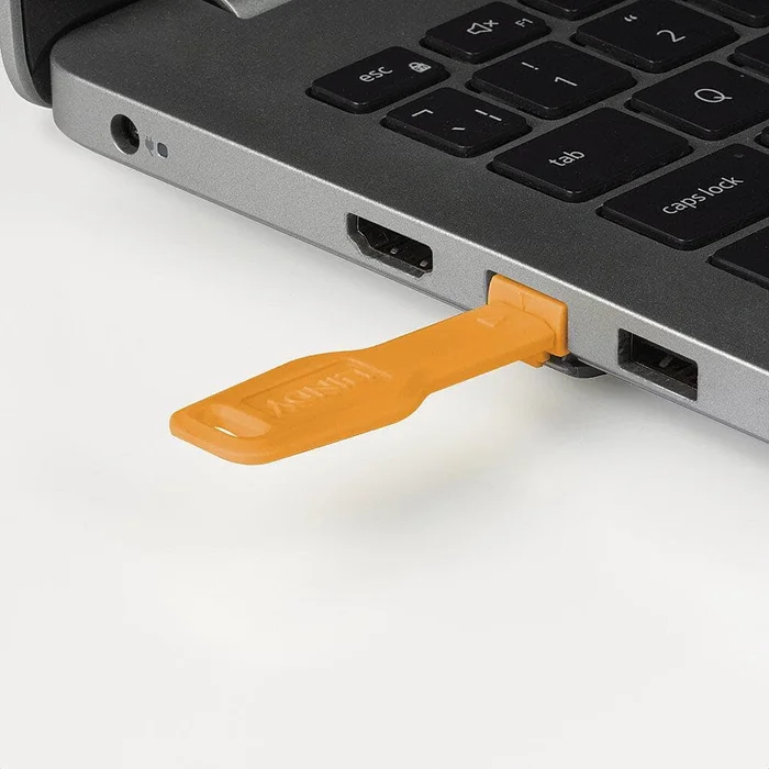 Die Anwendung ist also einfach: Setzen Sie das Schloss auf den Schlüssel und stecken es dann in den freien Port. Wenn Sie dann den Schlüssel herausziehen, verriegelt sich das Schloss im Port. Zum Entfernen stecken Sie den Schlüssel wieder in das Schloss zurück bis er einrastet und ziehen das Schloss heraus.