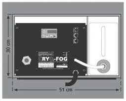 In einem kompakten Flightcase (67 x 51 x 30 cm) sind sowohl das Nebelgerät, ein Lüfter sowie die Kühlkammer integriert. Der Bereich neben dem Nebelgerät dient zum Einschub eines 5L-Kanisters Nebelfluid.