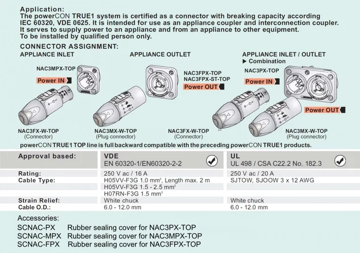 Der powerCON TRUE1 ist ein verriegelbarer Gerätesteckverbinder für eine Strombelastbarkeit bis 16 A. Er ersetzt Kaltgerätestecker dort, wo eine sehr robuste Lösung mit einer Verriegelung gebraucht wird, um eine sichere Stromverbindung zu garantieren.