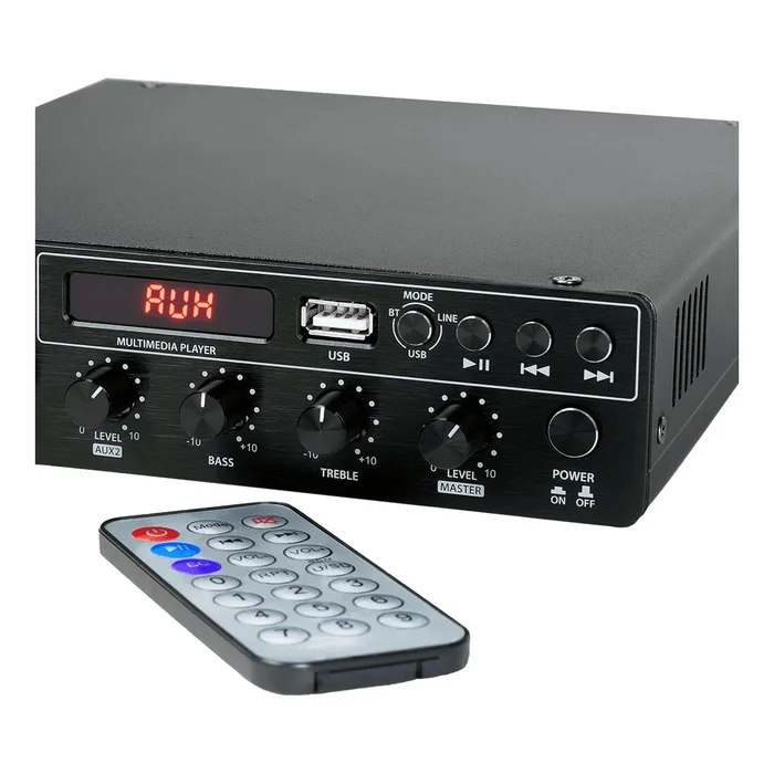 Der Next Audiocom MX120 ist ein 120 W (100 V) Verstärker mit einer kompakten Größe und einem geringen Gewicht für die Integration in Ihre kleinen bis mittelgroßen Installationen. Mit MX120 können Sie mehrere Audiosignallösungen USB, RCA, XLR, AUX und Bluetooth haben. Dieser Verstärker enthält einen Multimedia-Player, mit dem Sie den USB steuern und reproduzieren können.