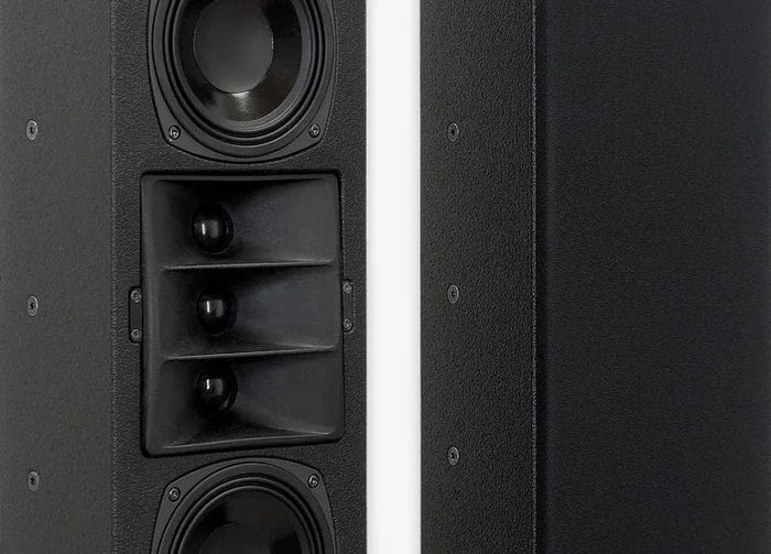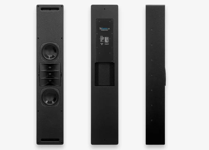 Das TriSource 10 Lautsprechersystem wurde speziell für Anwendungen in Kombination mit größeren Displays konzipiert, bei denen eine sehr gute Tonqualität und größere Reichweite gefordert sind. Die gute Integrationsfähigkeit wird durch die geringe Einbautiefe und neutrale Optik erreicht. Zur Anpassung an die verschiedenen Displaygrößen sind individuell gefertigte Schallwandabdeckungen lieferbar. Die spezielle Anordnung von zwei 5” Langhubchassis und drei horngeladenen 1.1” Tweetern arbeitet nach dem 3-Quellen Prinzip. Damit wird eine besonders gleichmäßige vertikale Bündelung erreicht, um einen hohen Direktschallanteil auch in größerer Entfernung zu realisieren.