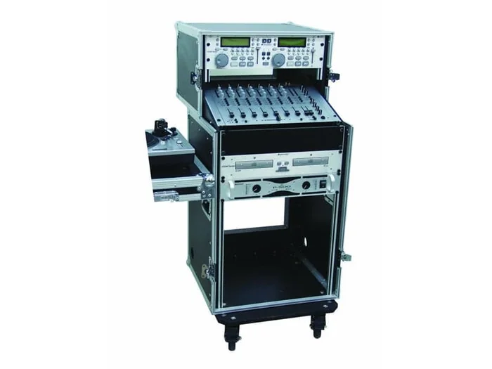 Professionelle Lösung für ein komplettes DJ-Setup; das heavy-duty Case bietet Platz für PA, Doppel-CD-Player, Mixer sowie 2 Plattenspieler und kann mit wenigen Handgriffen auf- und abgebaut werden