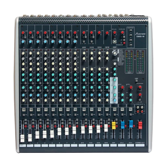 Mit dem Studiomaster C6XS-16 erhalten Sie einen professionellen 16-Kanal-Livemixer, der Ihnen eine hervorragende Klangqualität sowie eine einfache Bedienung garantiert. Der C6XS-16 ist ausgestattet mit 10 Mikrofoneingängen, 4 Stereo-Eingängen, einem 3-Band-EQ, einer DSP-Effekteinheit mit 16 Programmen und einer USB-Audio-Funktion zur Stereo-Aufnahme und -Wiedergabe.