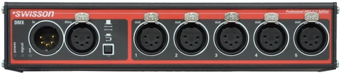 - Signalverteilung: 1x DMX in (5-pol.) auf 5 x DMX out (5-pol.) + thru (5-pol.)