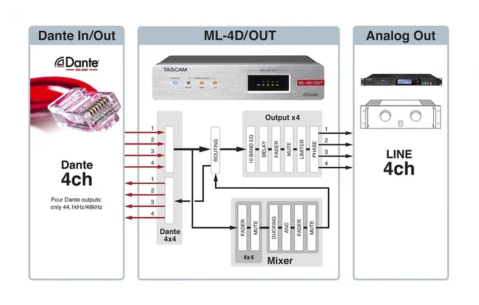 Der ML-4D/OUT ist Teil der „Dante Compact Processor Series“ von Tascam, die verschiedene kompakte Audiowandler mit halber Rackbreite für Dante/AES67-Netzwerke umfasst. Die Modelle fügen Dante-Audionetzwerken in öffentlichen Einrichtungen, Rundfunkstationen, Aufnahmestudios oder exklusiven Wohnumgebungen problemlos zusätzliche Eingänge und Ausgänge für Mikrofon/Line- oder AES/EBU-Signale hinzu und können beliebig kombiniert werden.