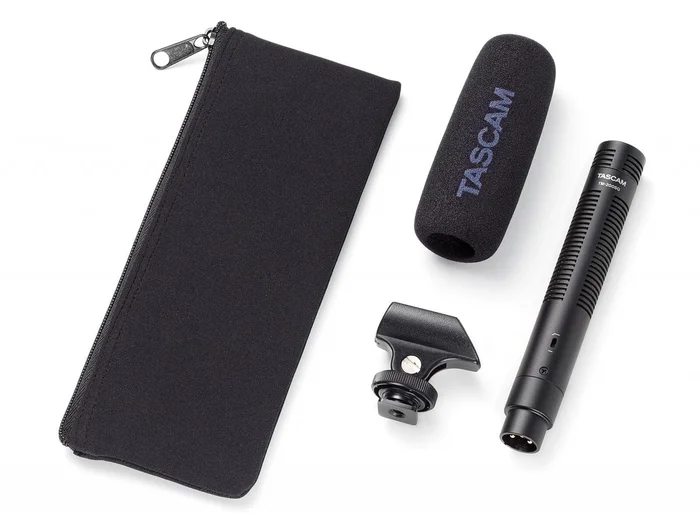 Das TM-200SG wird über Phantomspeisung mit Strom versorgt. Blitzschuh-Befestigungsclip, Windschutz und Aufbewahrungstasche sind im Lieferumfang enthalten.