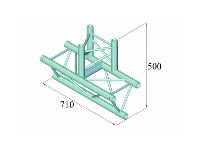 Die drei Gurtrohre sind aus 50 mm Aluminiumrohr mit 2 mm Wandstärke gefertigt und geben diesem System ein hervorragendes Gewichts-Belastbarkeitsverhältnis. Die Streben haben einen Durchmesser von 16 mm bei 2 mm Wandstärke und lassen viel Spiel zum Einhängen von Couplern, Haken und Schellen. Mit Außenmaßen von 290 mm bzw. 257 mm handelt es sich um ein stabiles Traversensystem für höhere Lasten und längere Haltbarkeit.
