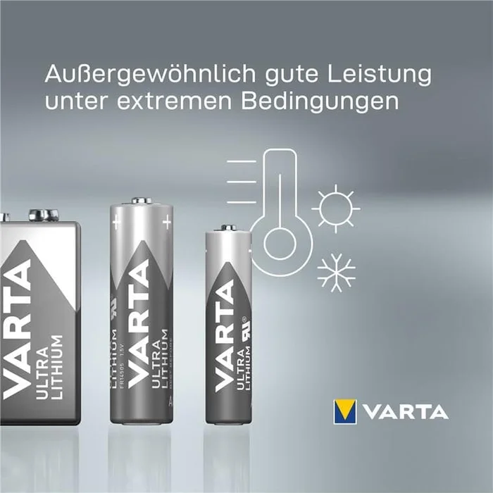 - VARTA Lithium-Batterien 6F22 sind ideal für Sport- und Outdoor-Einsätze geeignet, da sie bis zu 38 % leichter als Alkaline-Batterien sind.