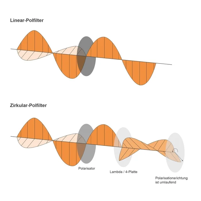 Zirkulare und lineare Polfilter funktionieren nach dem gleichen Prinzip. Optische Gitter auf der Filterfolie sorgen dafür, dass nur lineare Lichtwellen zum Objektiv gelangen, deren Ausrichtung mit der des Gitters übereinstimmen. Im Gegensatz zu einem linearen Polfilter besitzt der zirkulare Polfilter ein zusätzliches Lamda/4 Plättchen. Dieses Plättchen ist dafür zuständig, dass die vorher im Polfilter entstandenen linearen Lichtstrahlen wieder in alle Bestandteile zerlegt werden und im Winkel von 90 Grad zueinander stehen. Gleichzeitig wird ein Bestandteil um eine Viertel Wellenlänge verzögert. Somit sind hinter dem Filter wieder alle Polarisationsrichtungen vorhanden. Dies hat zur Folge, dass die durch Polfilter oftmals entstehenden Autofokusprobleme bei zirkularen Polfilter nicht auftreten.