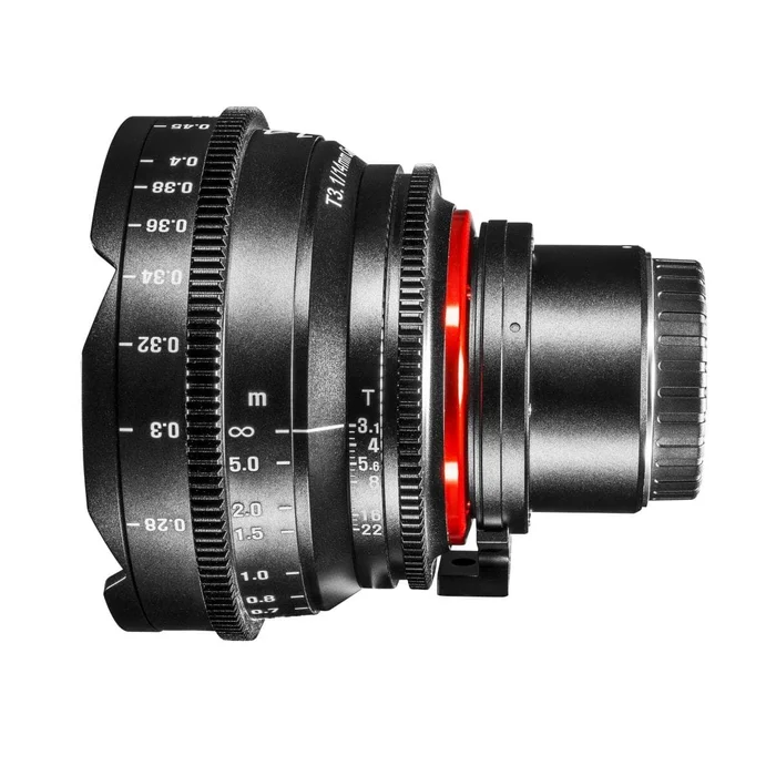Die Linsen-Konstruktion aus 13 Linsen in 12 Gruppen wurde in einen robusten Tubus aus Aluminium verbaut. Die notwendigen Einstellungen am Follow Focus- oder Blendenring sind stufenlos und lassen sich an alle Follow Focus Systeme mit 0,8 mm Zahnkranz befestigen. Die 9 Blendenlamellen des 14 mm Cinema Objektivs sorgen für ein nahezu kreisrundes und schönes Bokeh.
