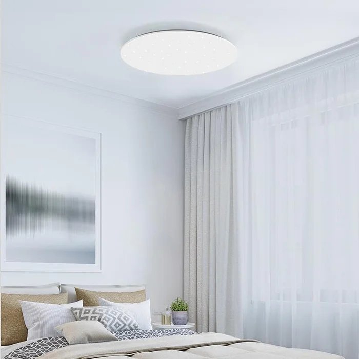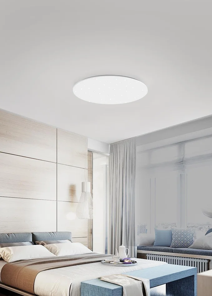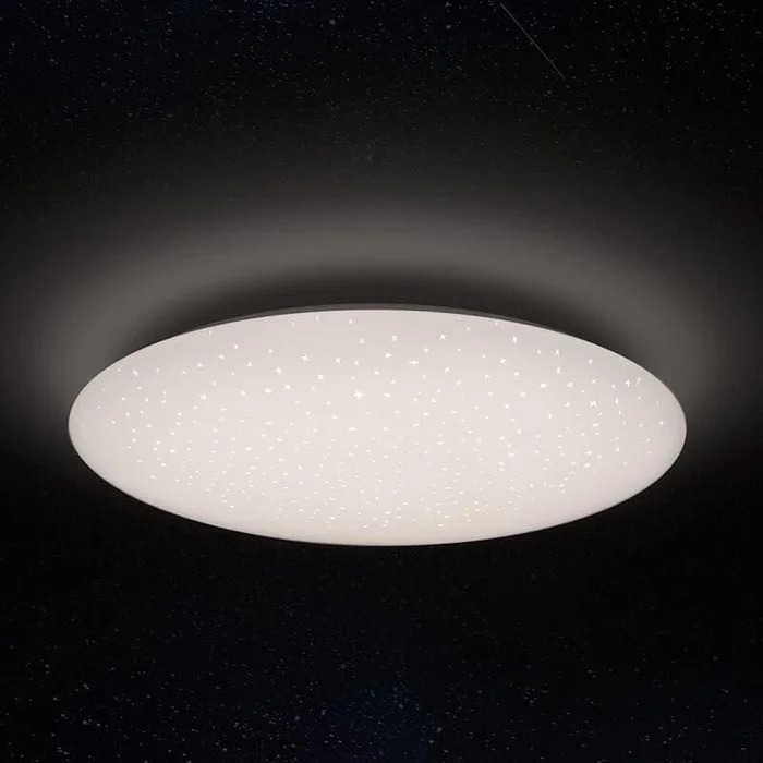 Das spezielle Lichtabdeckungskonzept verwendet ein transparentes Acrylmaterial und ein einzigartiges Folierungsverfahren, mit dem ein weiches Licht erzeugt wird, das nicht zu grell ist und trotzdem eine wirkungsvolle Ausleuchtung des gesamten Raumes erzielt (besonders geeignet für Wohn- und Schlafzimmer bis 20 m²). Die LEDs der Galaxy weisen eine hohen Farbwiedergab auf (Ra ≥ 95), sodass die Farben wie in natürlichem Sonnenlicht wiedergegeben werden. Zudem können Sie je nach Anlass Helligkeit und Farbtemperatur einstellen – von warmweiß (2700 K) bis kaltweiß (6000 K). Die Galaxy unterstützt den Mondlichtmodus, dessen sanftes und angenehmes Licht ideal für die Nacht ist und die Augen schont.