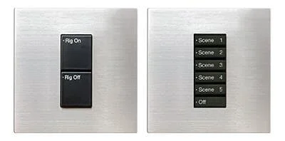Bedienfelder sind in gebürstetem Edelstahl mit 2 Tasten für Ein/Aus und mit 6 Tasten für Szenen 1-5 und Aus erhältlich.